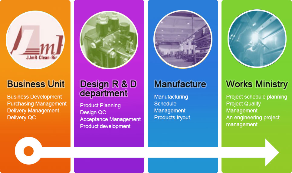JJmR-Clean-Air Solution was established in 2004 and started its business by designing and manufacturing customized iron (plastic) pieces, the company took a steady pace to expand in several years and then followed customers' demands of semiconductor and optoelectronics industries and other industrial to design, develop and manufacture own brand products. The company continues to improve product design in responding customer's needs for the expectation of meet customers' high-efficiency and zero-risk requirements.